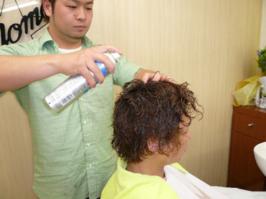 育毛ローションで、頭皮のマッサージ。首、肩周りも入念にマッサージします。