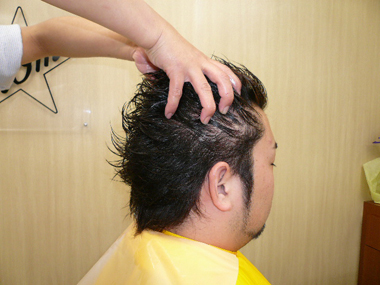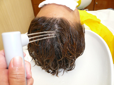 ミクロパウダー配合の頭皮クレンジング剤を塗布