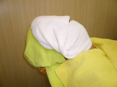 施術のおわりに温かいタオルで首の後ろをじ〜んわり温めます。