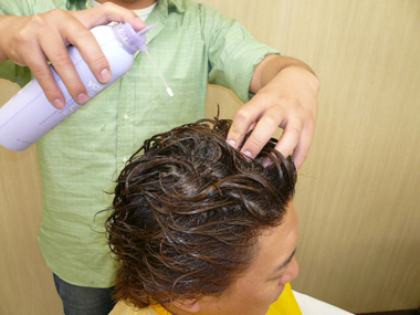 ミクロパウダー配合の頭皮クレンジング剤を塗布