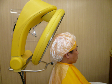 育毛ローションで、頭皮のマッサージ。首、肩周りも入念にマッサージします。