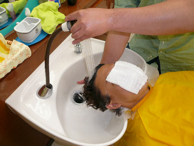 ハーブ水の洗浄が終わったら、高圧シャワーでよくすすぎ、トリートメント剤で頭皮と髪の状態を整えます。